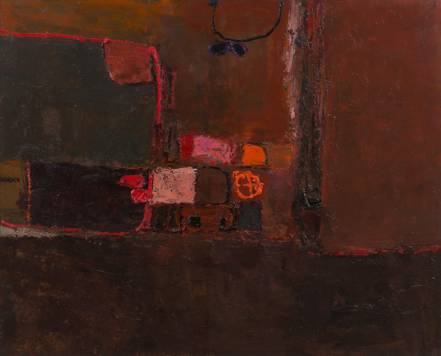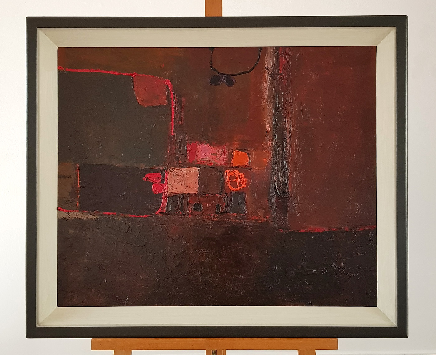William Burns is best known for his poised and thoughtful post-war modernist work, depicting Scottish life and landscape. Sea Town, is a powerful late painting by Burns. It is an exploration of memory, abstraction, and the unique aerial perspective shaped by his experience as a wartime pilot. Burns served in the RAF during the Second World War, and the experience of viewing the world from above would shift his entire practice. Sea Town possibly references Arbroath, translating the coastline into a structured aerial landscape, using impasto and a bold, earthy palette of reds and browns. The painting is anchored by a broad, dark horizontal band, a compositional device that separates sea from land and heightens the tension between flatness and depth, between observed detail and remembered form. Rather than describing a scene in representational terms, Burns constructs the landmass and coastline into a dynamic, composition, evoking a sense of the terrain as seen from altitude; distilled, abstracted, and emotionally charged.