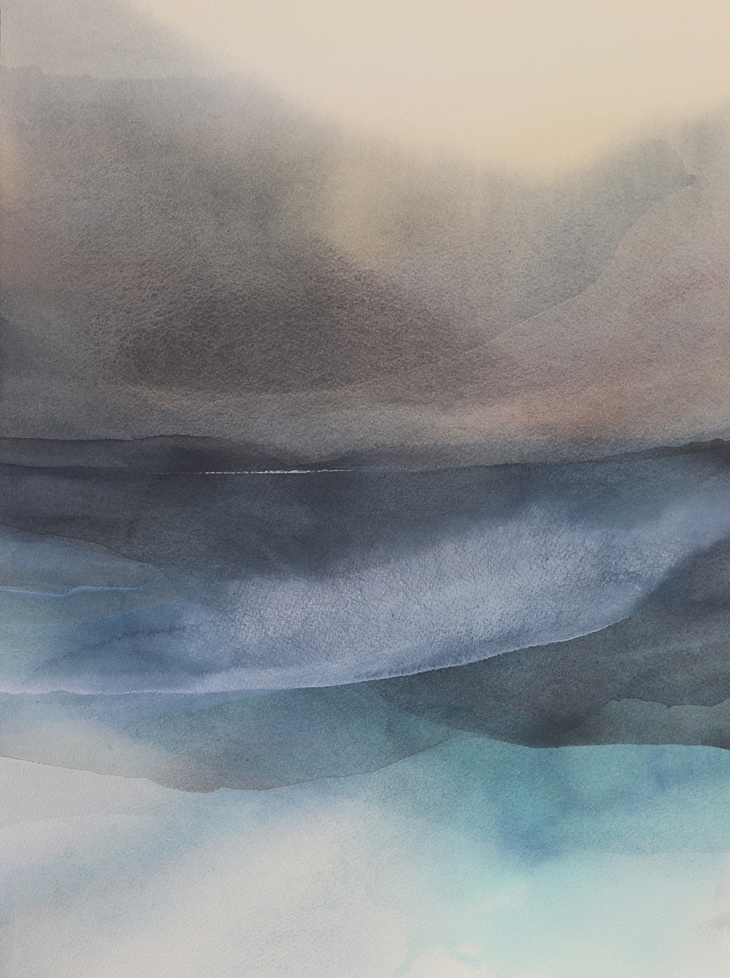 ‘There’s a point at which the act of painting and the inherent action of nature align themselves and that frequently happens in watercolour. I consider it the most natural of all the painting mediums, comprising pigment, a binder which is mainly gum arabic, and water, the drying process leaving the pigment on the surface. The two extremes of stillness and flow and the myriad activity between the two are what make watercolour, for me, the most natural medium with which to depict the extremes of the Northern landscapes. I have painted this subject for over 40 years, and it continues to provide a source of excitement and exploration. I have no wish to simply record what I see. I do not seek sedate topographies often associated with the term ‘watercolour landscapes’. Instead, I prefer the uncertain balance between abstraction and reality.’ – Peter Davis