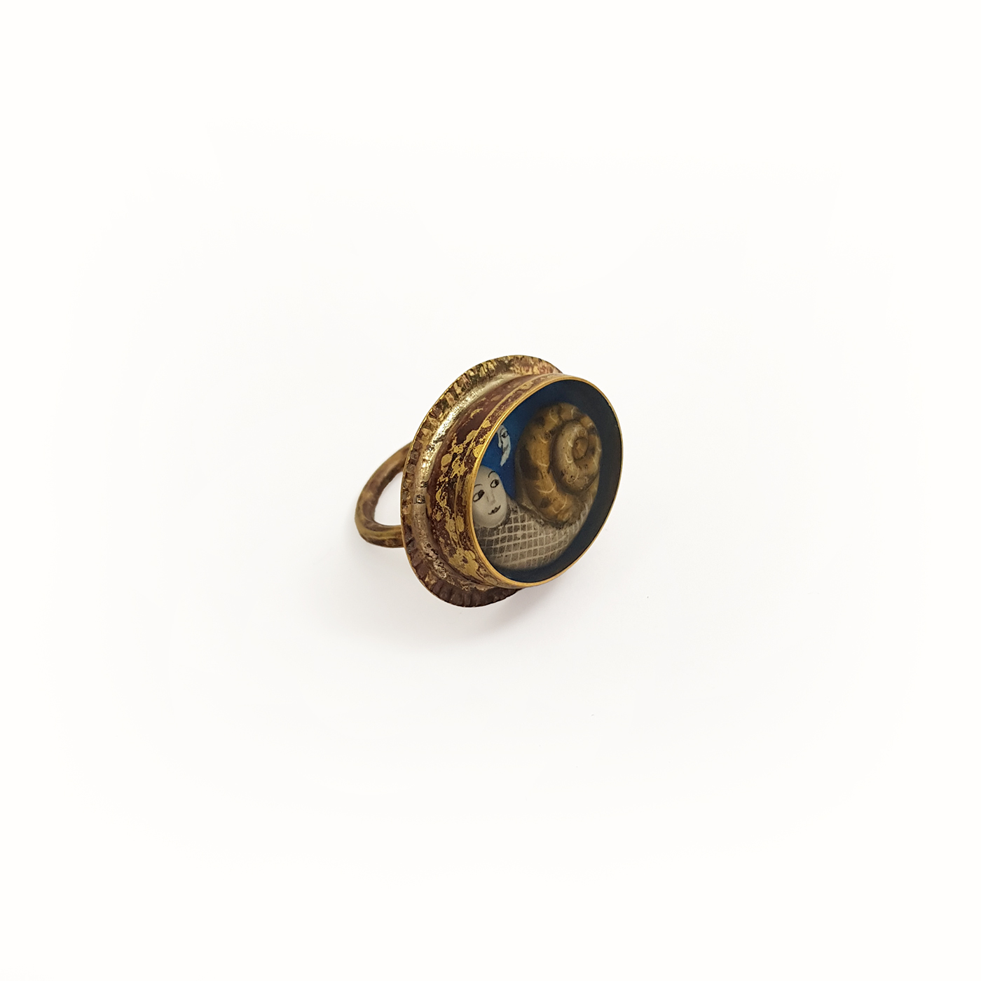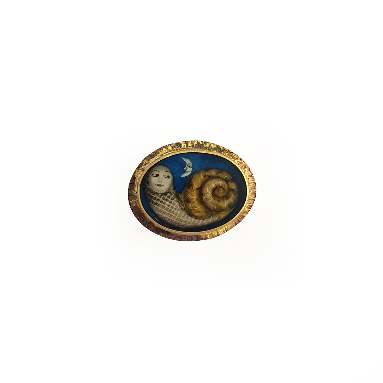 Rachel Larkins is a designer maker whose practice has focussed on creating jewellery with a strong sense of narrative and a nod to the tradition of miniatures. Larkins works primarily in resin, brass and wood, often encapsulating imaginary scenes and figures which are hand modelled and painted. Based in the village of Sopley, Larkins’s influences range from the surrounding rural landscape and seasonal folklore to magical realism in literature and painting.
