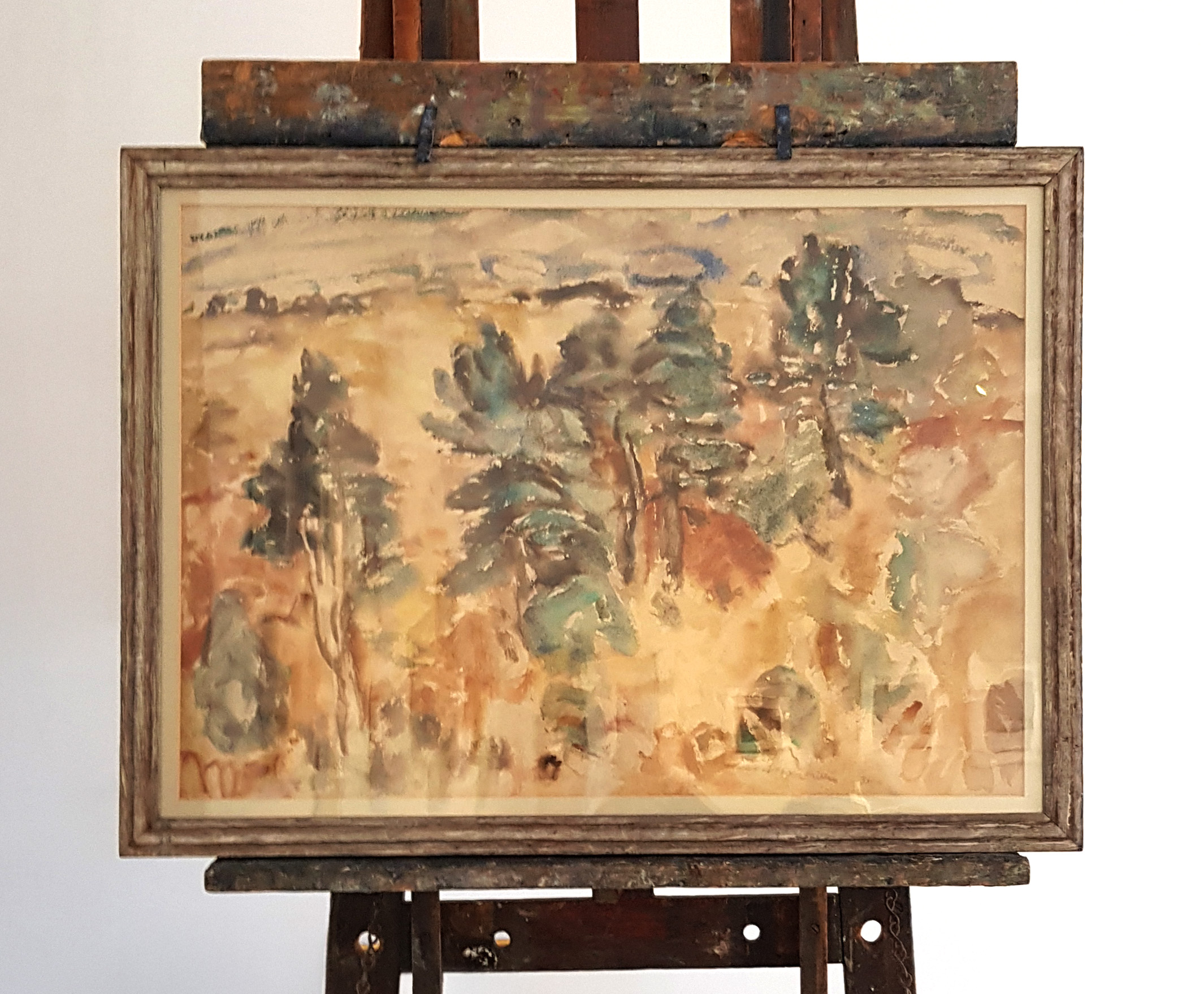 Gillies’ watercolours of the twenties and thirties are generally in watercolour alone, painted ‘wet on wet’. These have a spontaneous and gestural quality and often portray a particular moment or some fleeting atmospheric effect. In Speyside, Gillies uses this technique to describe tumultuous weather sweeping through the woods.