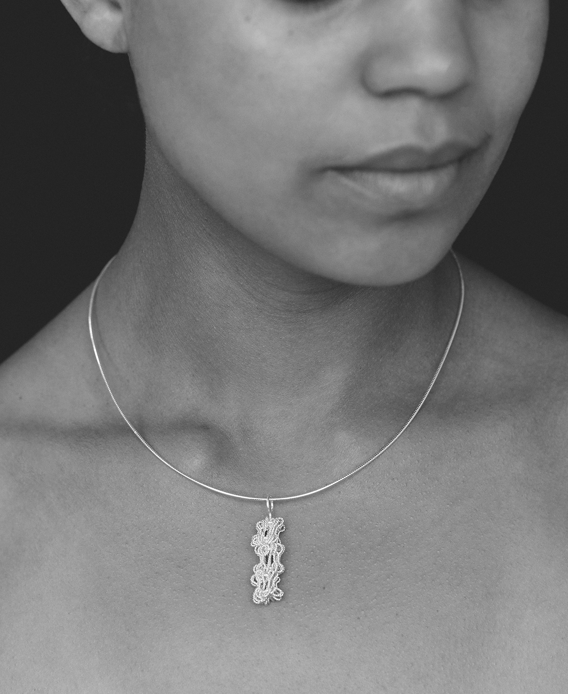 Ruth has been designing and making playful, sculptural jewellery since 2015. Her eponymous jewellery collection is made by hand using recycled silver and gold and is inspired by both the subtle details within fabrics as well as the intricate constructions within textile machinery. Ruth finely twists wire using an old-fashioned hand drill which is then cut and wrapped around frames to create tactile, refined forms – like dangling architecture.