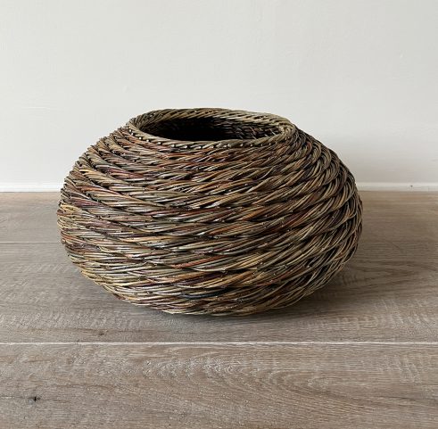 ‘My journey with willow began almost 40 years ago. Despite having virtually lived and breathed willow for many of those years there has always been more ideas to try out and forms to explore. With less pressure in my later years, I have had time to play and experiment and indeed go deeper in those that had lasting appeal. The introduction of twisted twigs from my garden as handles and gold leaf on a ’shopper’ is a playful tongue in cheek juxtaposition which may raise questions… What is it for? Is it a shopper? Do we need shoppers these days?’ – Lise Bech