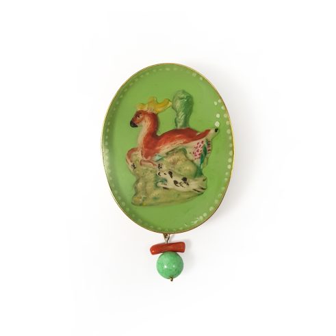 Rachel Larkins is a designer maker whose practice has focussed on creating jewellery with a strong sense of narrative and a nod to the tradition of miniatures. Larkins works primarily in resin, brass and wood, often encapsulating imaginary scenes and figures which are hand modelled and painted. Based in the village of Sopley, Larkins’s influences range from the surrounding rural landscape and seasonal folklore to magical realism in literature and painting.