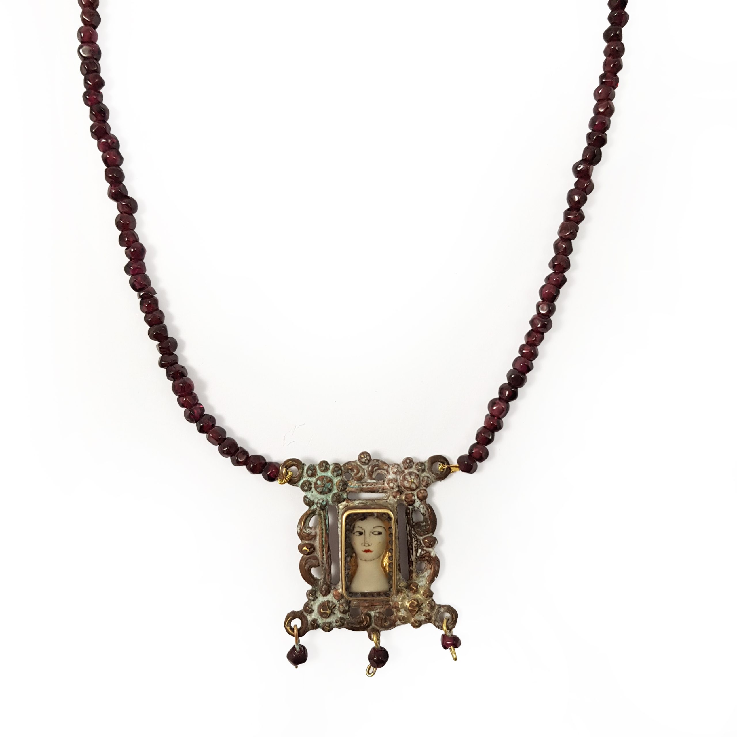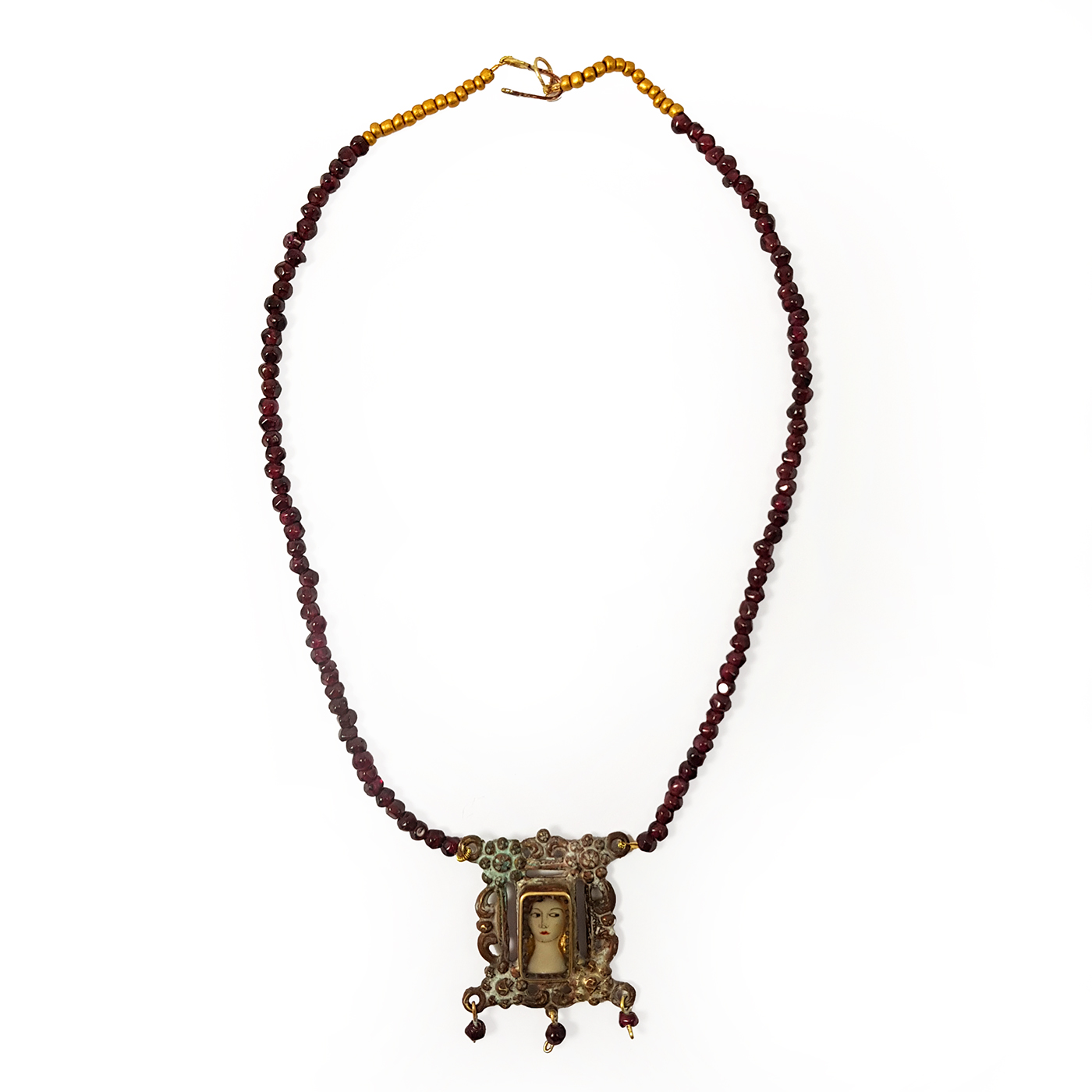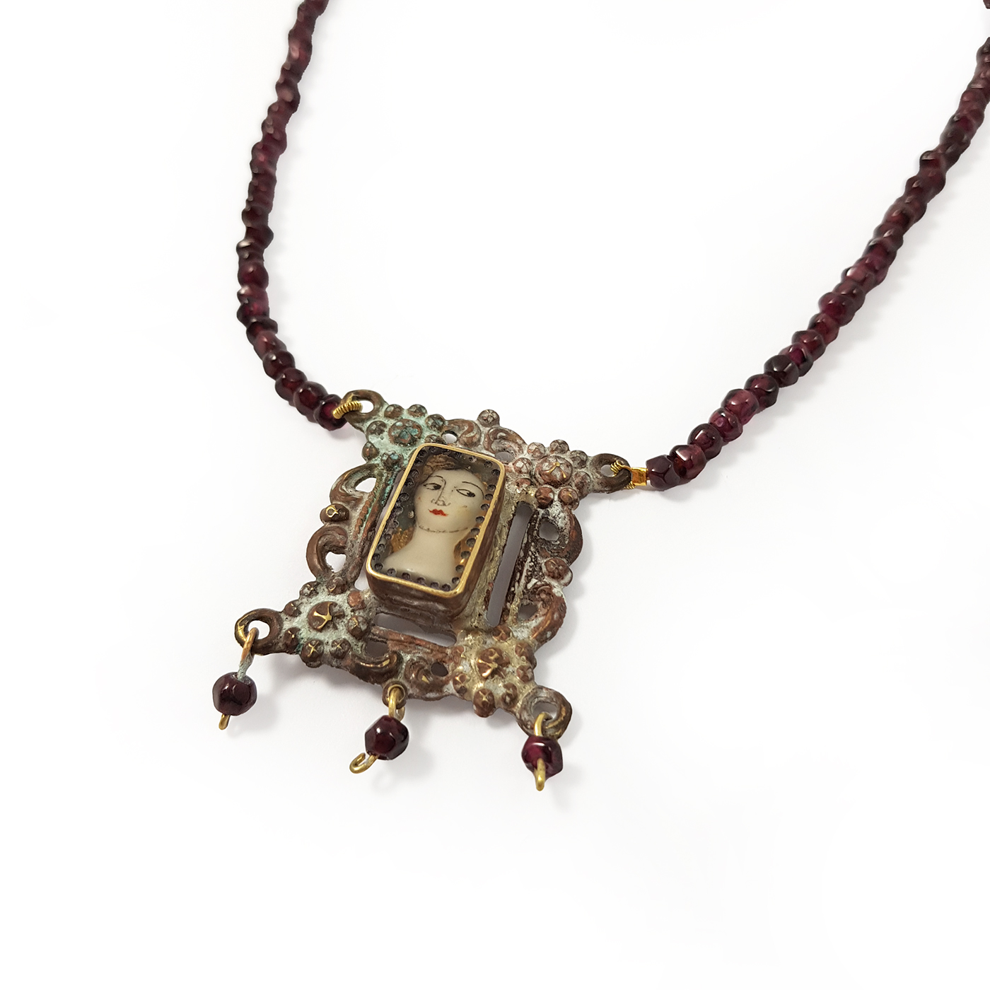 brass, resin, hand painted insert, garnet beads, gold coated glass beads