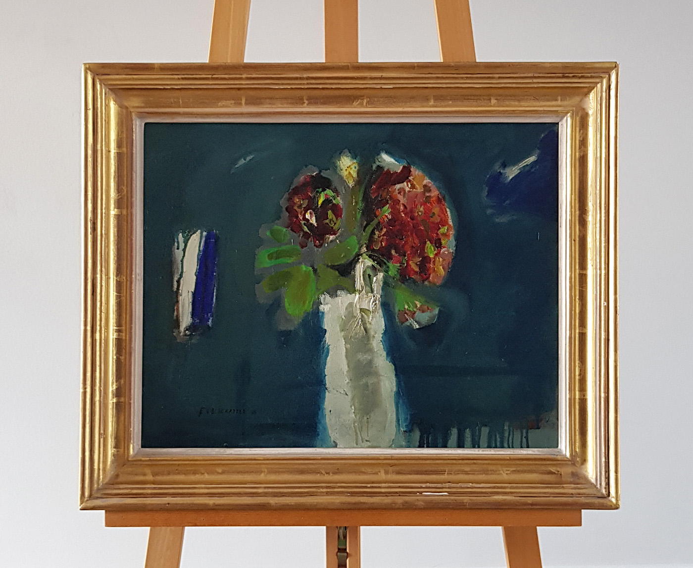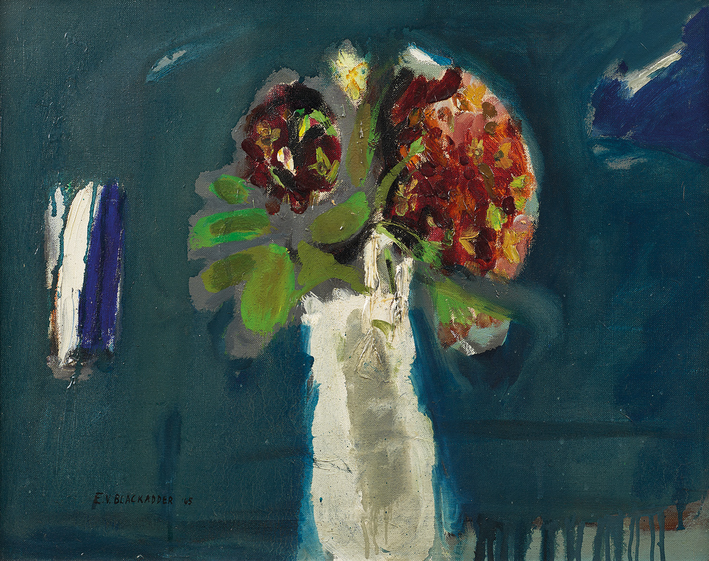 In Still Life with Flowers, painted in 1965, Blackadder takes a time-honoured subject, the still life, and turns it into a composition that is both bold and subtly subversive. At first glance, the white vase of flowers occupies the centre of the canvas, but around it, Blackadder constructs a world of unexpected colour and painterly tension.