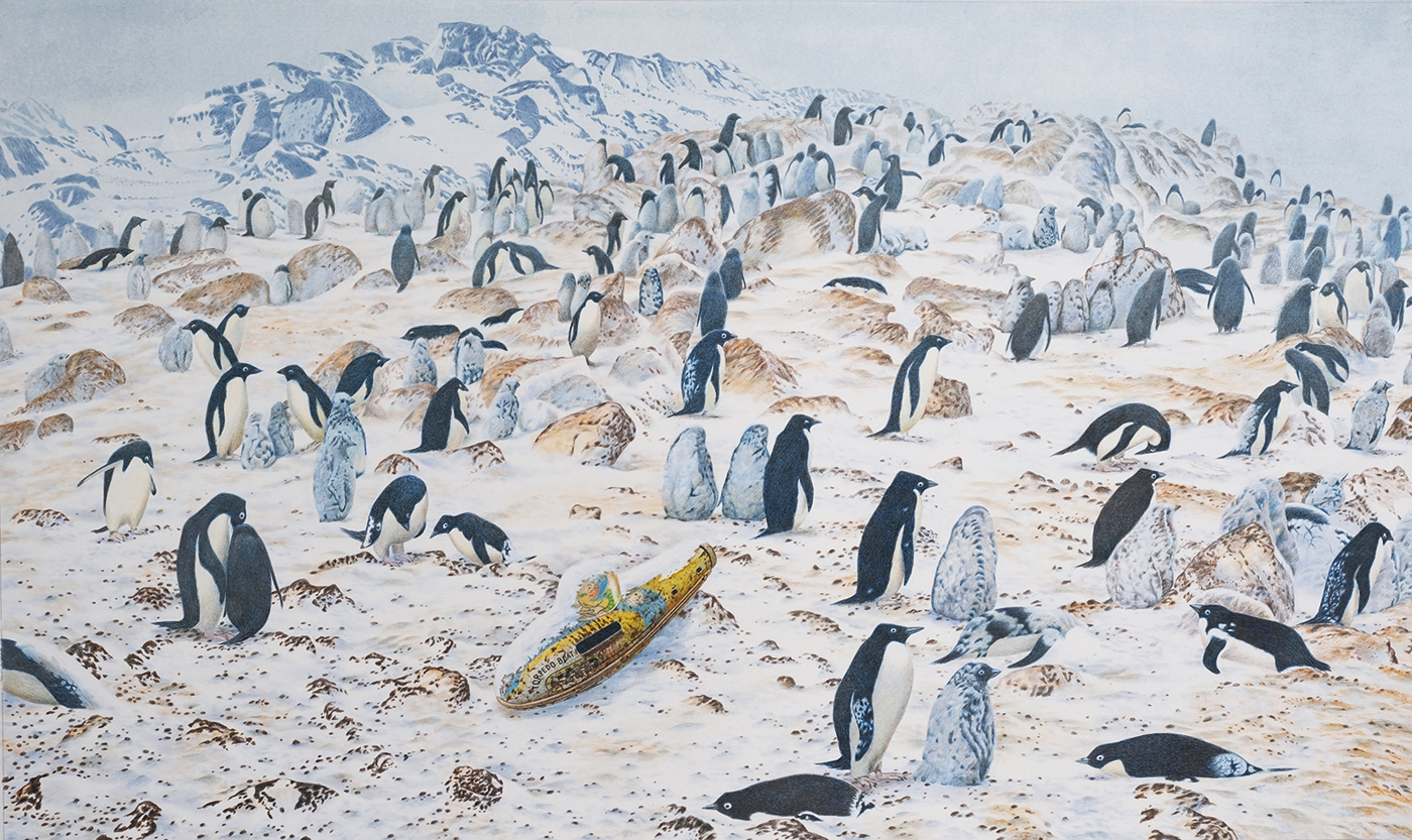 Behrens’s practice inhabits a fictional world called Naboland, a mythical place of snow and ice. For over forty years, the artist has examined this world through the lens of a real history of discovery, with the artist adopting the role as explorer to create an archive of drawings, paintings, prints and installations which record the found objects and landscapes of Naboland. 2025 will mark the 50th anniversary of Naboland.