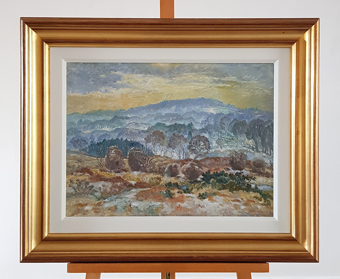 In the foreground, winter-bleached grasses tuft across gentle slopes, rendered with painterly restraint and delicacy. A misted band of blue-toned woodland follows, its softness suggesting the hush of a cold morning. Above, the distant hills lift into a pale sky touched by first light, a quiet optimism woven into the landscape’s subdued palette. The finely judged brushwork evokes the fragility of winter, and the enduring presence of the natural world in repose.