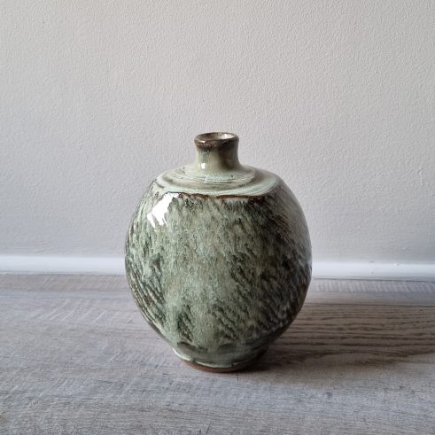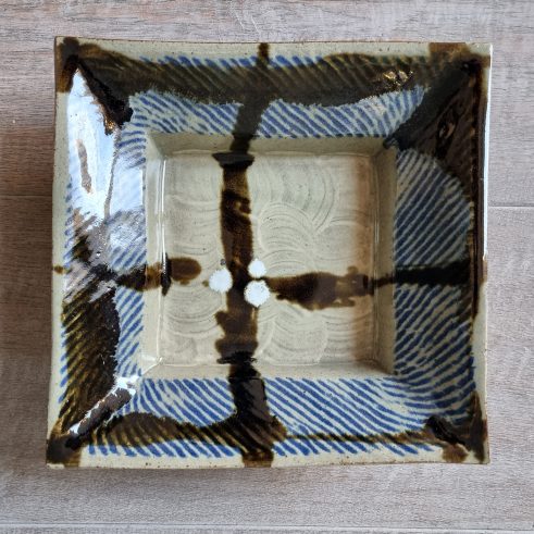 He throws with robust stoneware clay and makes a variety of press moulded bottles and dishes. With the use of rope and material, each piece is then inlaid with different coloured slips. His glazes are made largely of local materials including wood ash and granite, all of his work is reduction fired in the sixty-five cubic foot gas-fired kiln, which he designed himself.