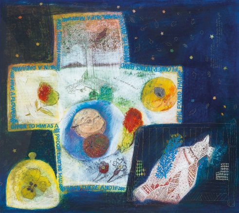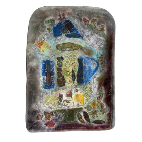 Sylvia von Hartmann has lived in Scotland for decades, originally based in the Scottish Borders, she now lives and works in the heart of Edinburgh’s Old Town. She is an artist known for her works on paper in water-based media and wax crayon and also specialises in printmaking. Her imagery is highly personal, a psychological iconography which must remain obscured; her forms, motifs, script, flora and architecture are revealed in a folk tale with no beginning or end. Revealed as they float past on a liquid surface, or retreat, detail rubbed back like the surface of an ancient sampler. Sylvia von Hartmann was born in Hamburg, Germany; she studied at the Werkkunstschule, before attending Edinburgh College of Art (1963–66).