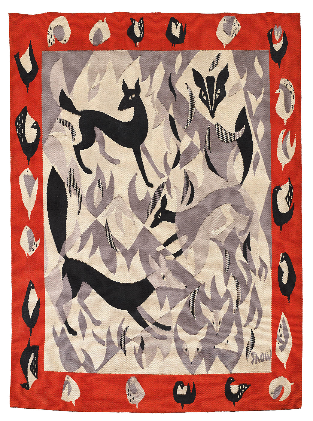 a tapestry alive with movement, colour, and metaphor. At its centre, lithe, dancing foxes twist and turn in rhythmic formation, their elongated forms and swishing tails creating a sense of balletic motion, flickering like flames. Shaw surrounds them with decorative flame motifs and a structured border of birds woven in a palette of red, orange, grey, and black. The entire composition sings with theatricality and formal precision, a woven ballet of folklore and abstraction.