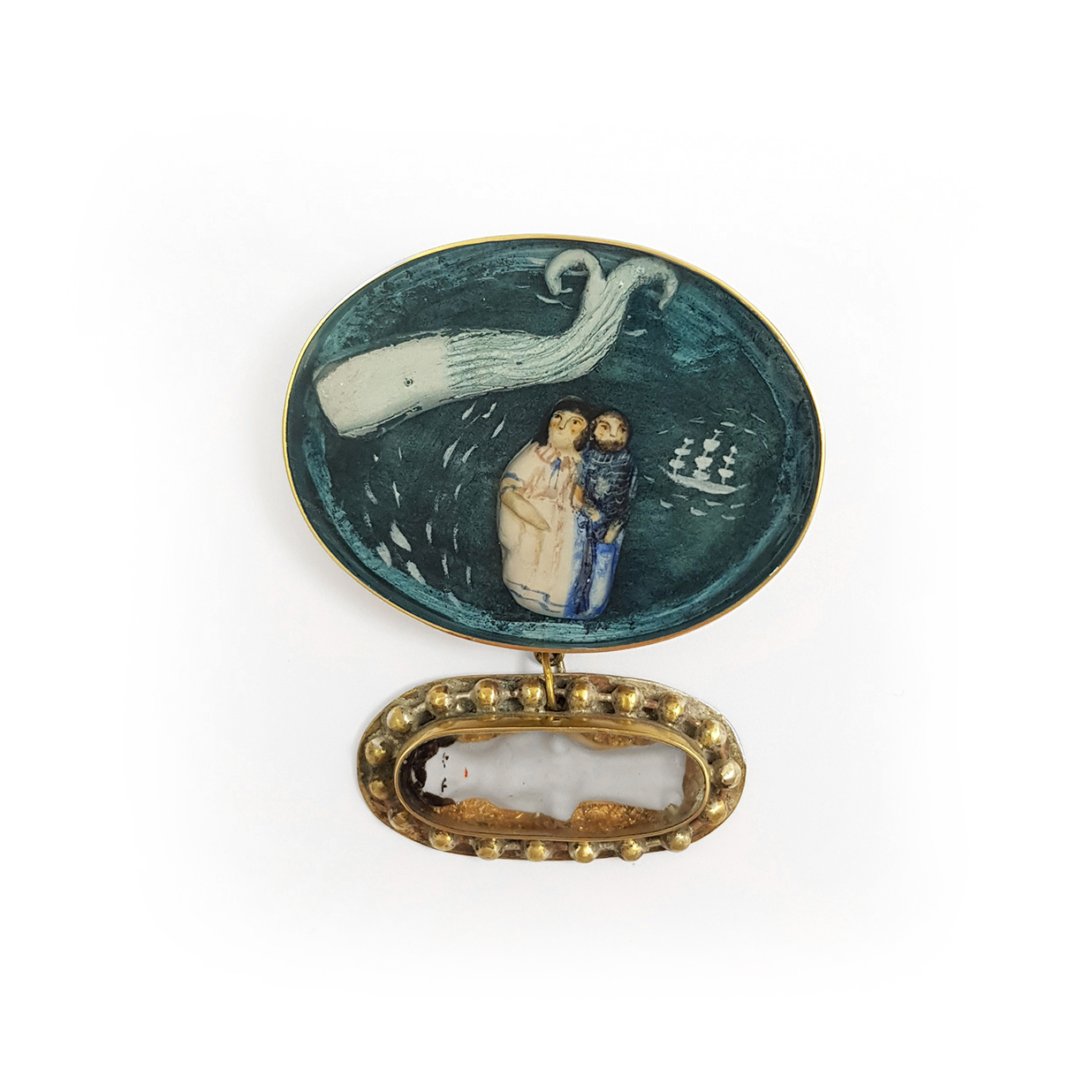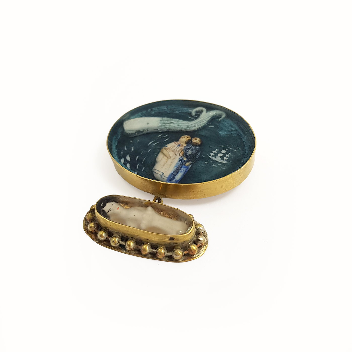 Rachel Larkins is a designer maker whose practice has focussed on creating jewellery with a strong sense of narrative and a nod to the tradition of miniatures. Larkins works primarily in resin, brass and wood, often encapsulating imaginary scenes and figures which are hand modelled and painted. Based in the village of Sopley, Larkins’s influences range from the surrounding rural landscape and seasonal folklore to magical realism in literature and painting.
