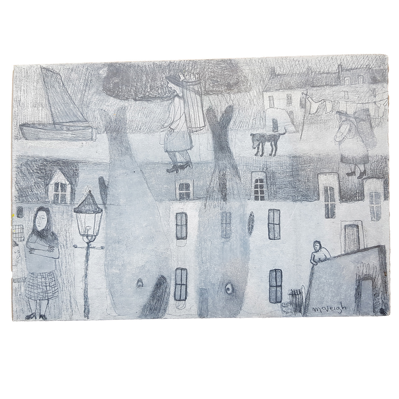 Michael McVeigh is a modern day folk artist who depicts the world around him. He is a participant observer who has created a naïve and sophisticated setting for contemporary life and history. There is something of the medieval chronicler about him; he draws and paints what is there, and what is worth depicting because it is an essential, occasionally quirky, part of human existence.