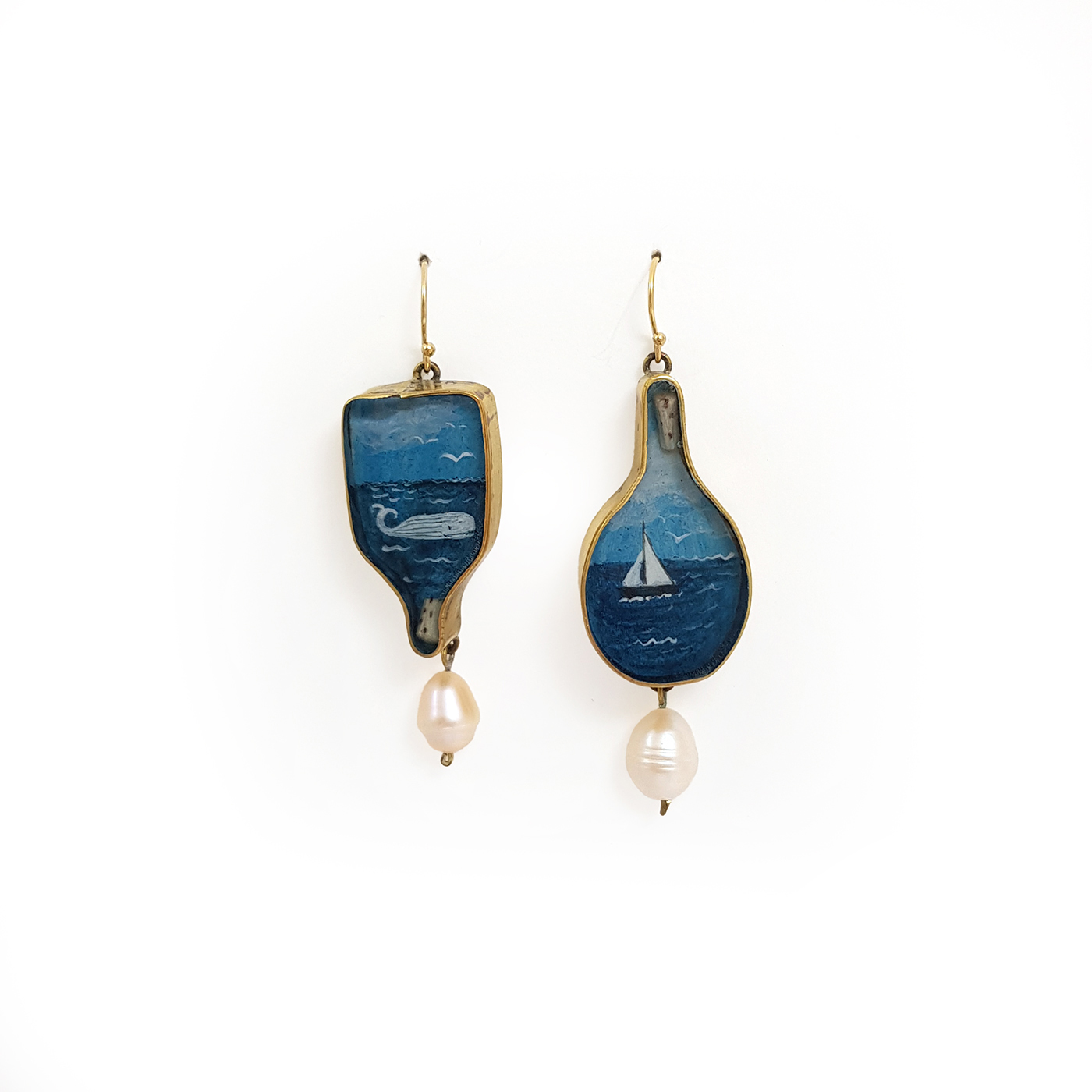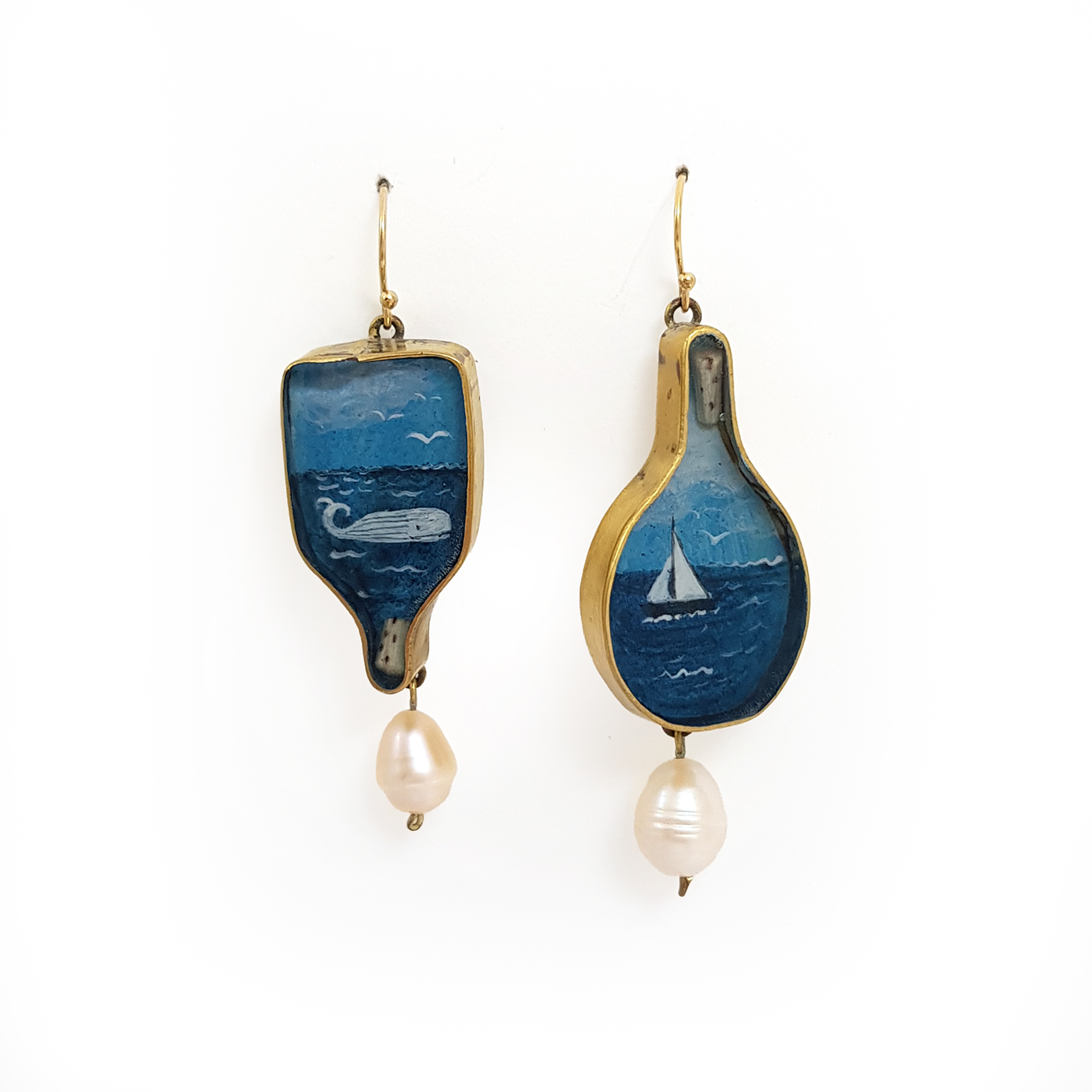 brass, resin, hand painted inserts, rolled gold hooks, freshwater pearls
