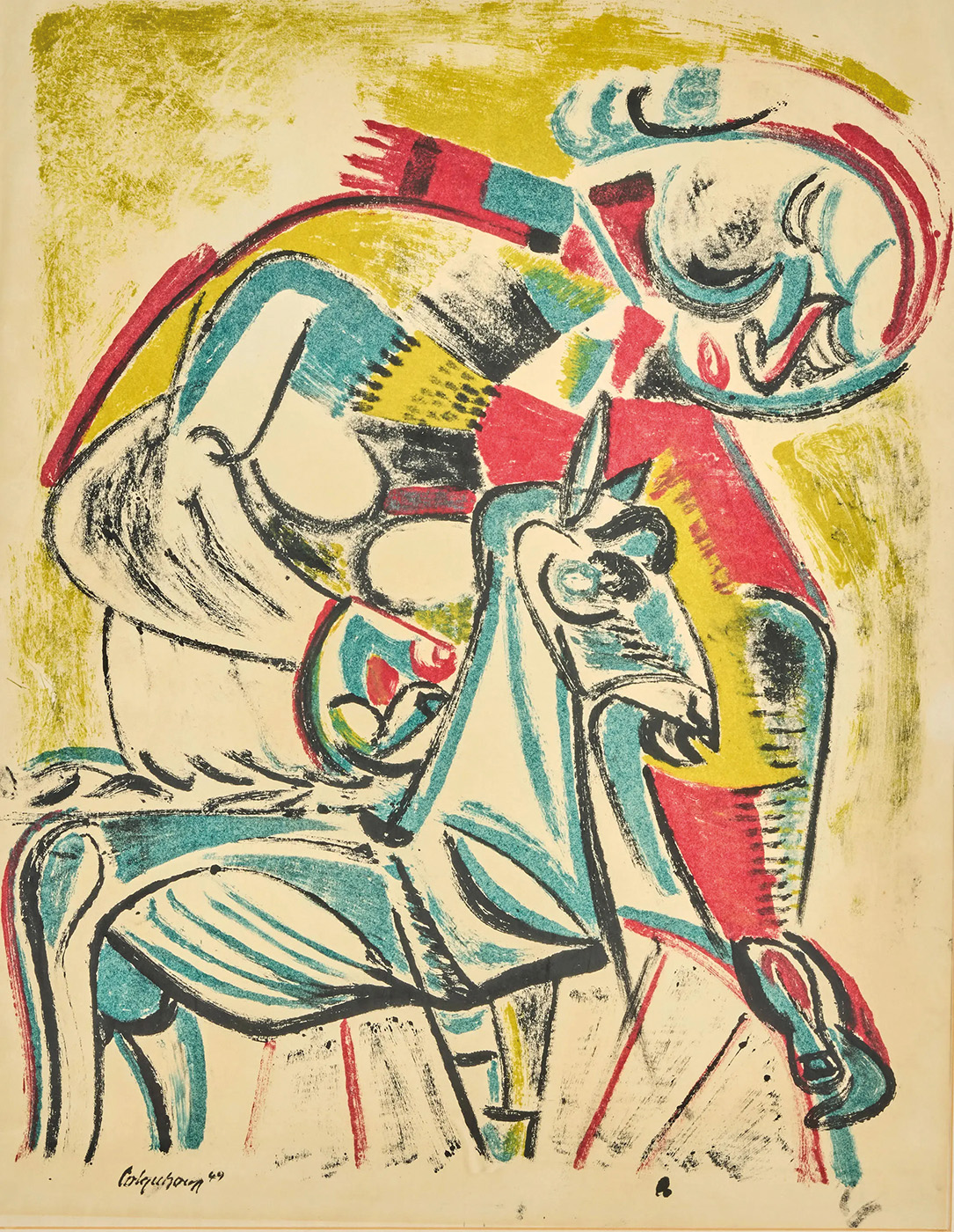 Executed as a monotype, Woman with Goat is a unique print made by transferring ink or paint from a smooth, hard surface to paper, and blends painterly immediacy with Colquhoun’s graphic strength. The figure and goat are rendered in bold, black line and a palette of sky blue, soft pink and yellows, creating a flattened, icon-like composition.