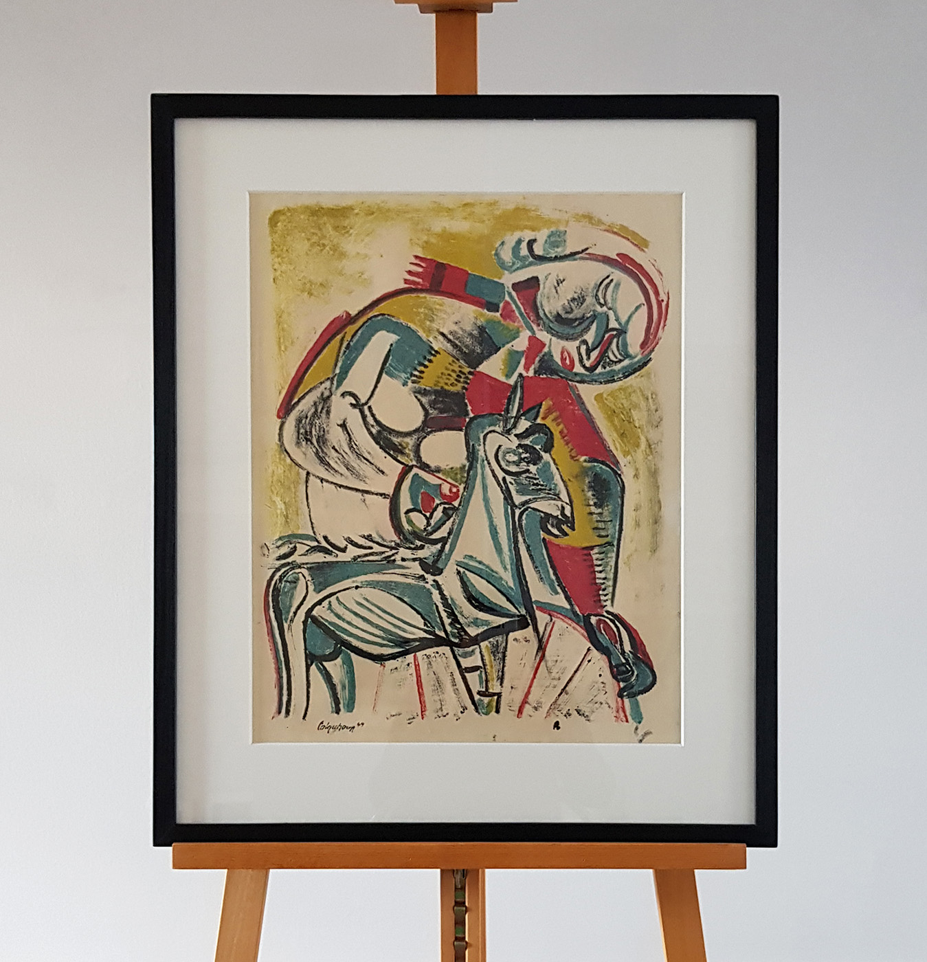 Robert Colquhoun was born in 1914 to working class parents from Kilmarnock, Ayrshire. His art teacher, James Lyle, helped him win a scholarship to Glasgow School of Art (1933-1937), subsequently winning a travelling scholarship to France and Italy with his lifelong friend, lover and companion, Robert MacBryde; with whom he is largely associated. Solo exhibitions under the guidance of Duncan MacDonald at the Lefevre Gallery on Bond Street were sell out sensations and the phrase ‘The Golden Boys of Bond Street’ was coined. During this high period, Colquhoun and MacBryde showed in The Scottish Gallery, 1944, British & French Artists. He later became a master of the monotype technique as he slowly moved away from the canvas. Following this success – post 1951 saw The Roberts, as they were known to their friends, fall in a sharp decline into a life of poverty. Robert Colquhoun died in 1962.